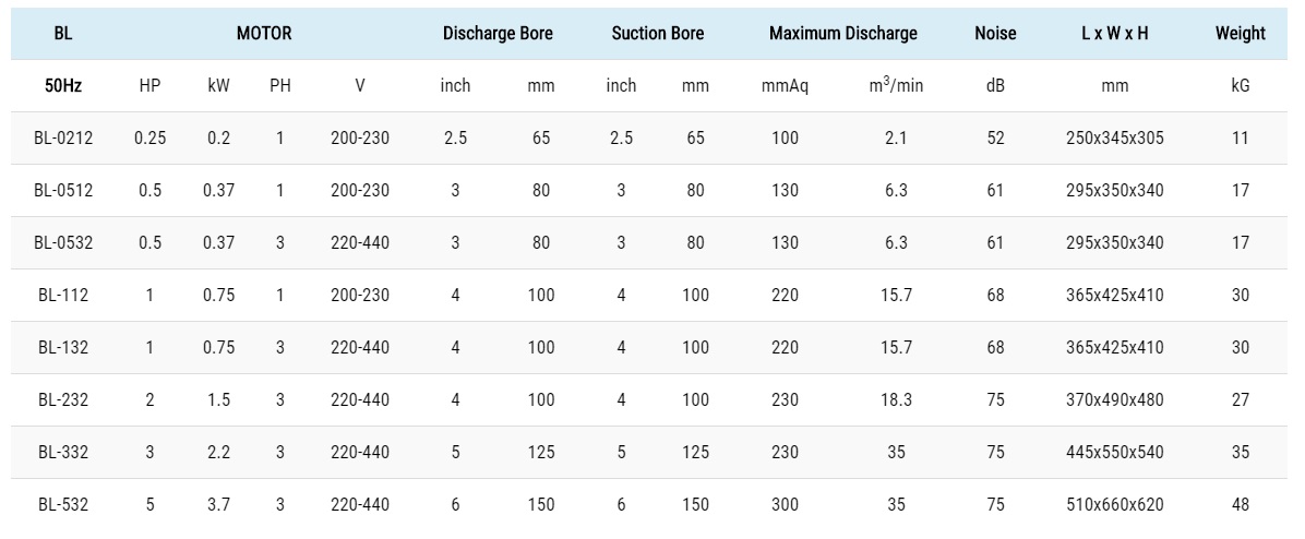 BP type turbo blowers feature direct drive motors from 0.5 HP to 5 HP, and provide a maximum pressure of 300 mmAq, and a maximum air capacity of 35 CMM. Showfou BP Type centrifugal turbo blower has a Large flow, lower noise and high efficiency due to special impeller design and is designed for easy installation with versatile capabilities for vacuum or pressure operation.