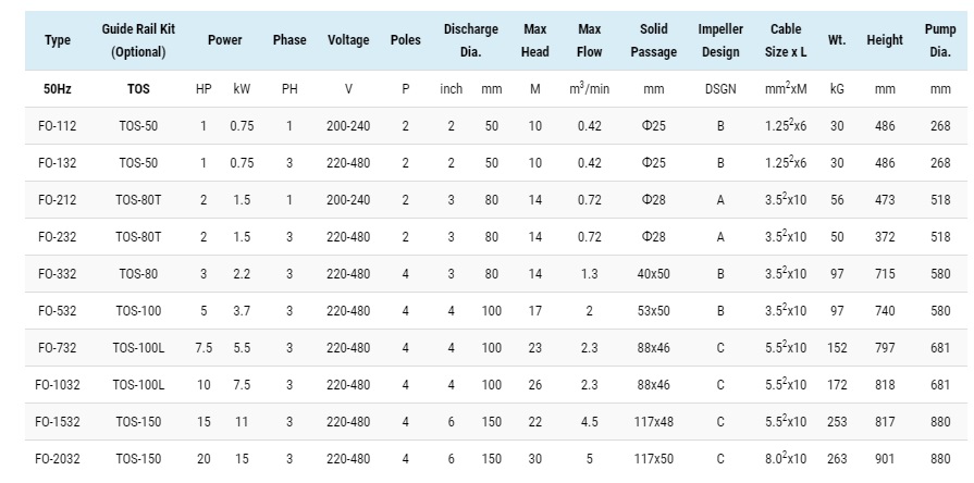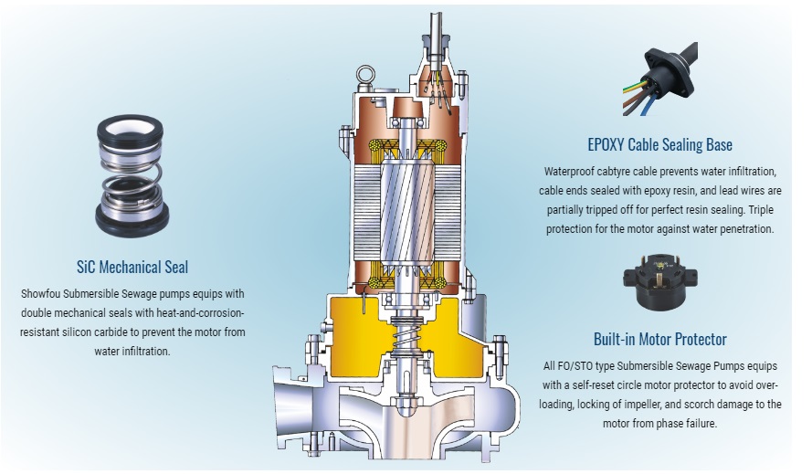 Showfou submersible sewage pump type FO range offers reliable and economical pumping of heavily polluted sewage in commercial, industrial and municipal applications. The FO type pump range provides excellent wastewater solid handling, and power up to 15 kW (20 hp).