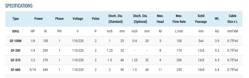 Pompa Showfou seri GF memiliki power: 100, 200, 370, 680Watt