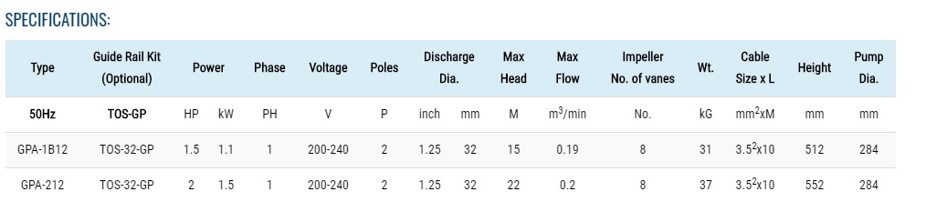 Construction on the GPA type macerator submersible is heavy duty cast iron and Stainless Steel. The GPA type macerator submersible pumps are free standing or can be mounted on guide rails for use in packaged pumping stations